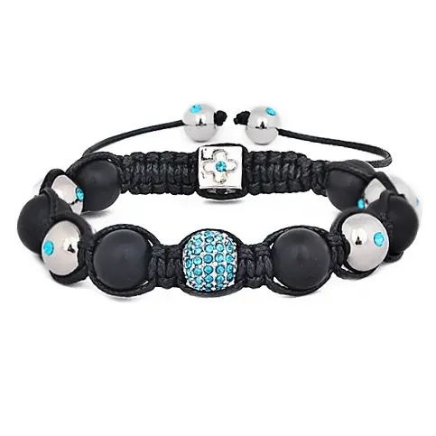 Náramek Shamballa s korálky Achát 10mm - černé korálky, korálky se zirkony Blue 10mm a korálky 10mm - postříbřeno.